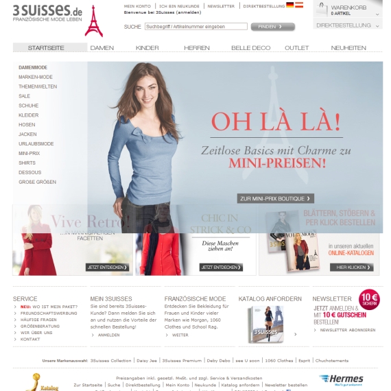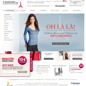 Im Onlineshop von 3Suisses können Sie eine Menge Geld sparen, wenn Sie französische Mode zu günstigen Preisen im Internet einkaufen möchten. Hier können Sie sich von französischen Designern und kreativen Ideen inspirieren lassen, also stöbern Sie durch die unzähligen Angebote. Hier wird Ihnen hochwertige und besonders stylische Mode für Kinder, Damen und Herren geboten.