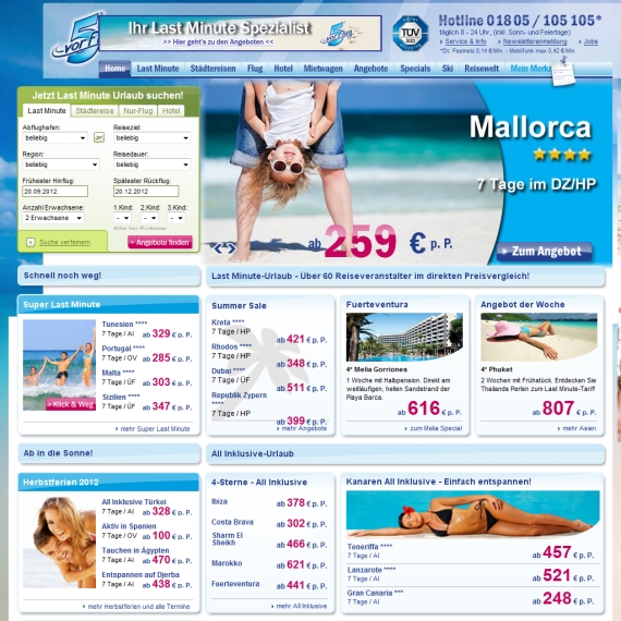 Last Minute Angebote begeben, werden Sie Ihren eigenen Augen nicht trauen wollen. Sobald Sie auf diese Seite gesurft sind, merken Sie schnell, weshalb sich 5vorflug in jedem Sinne positiv von der Konkurrenz abhebt. Merken Sie sich diese Adresse, denn Sie werden nirgendwo anders mehr buchen wollen. Wenn jemand Bescheid über die aktuellen Last-Minute-Angebote weiß, dann ist es 5vorflug!