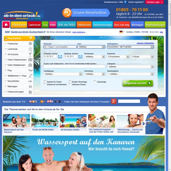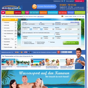 Sichern Sie sich zahlreiche Vorteile, wenn Sie bei Ab-in-den-Urlaub buchen, denn hier finden Sie eine riesige Auswahl an Reisen aller Art vor. Nebenbei erwartet Sie noch ein interessanter und kostenloser Newsletter, so dass Sie immer über die Spezialangebote informiert bleiben. Bestimmt ist Ihnen das erfolgreiche Unternehmen bereits aus diversen Medien, etwa aus dem Fernsehen bekannt, also warum zögern Sie noch? Nebenbei wird das Reiseportal auch von Verbraucherschutz.de empfohlen, so dass Sie sich immer auf der sicheren Seite fühlen können. Sparen Sie bares Geld, wenn Sie bei der Buchung Ihren Ab-in-den-Urlaub Rabattcode verwenden, welche Sie auf unserem Portal erhalten!