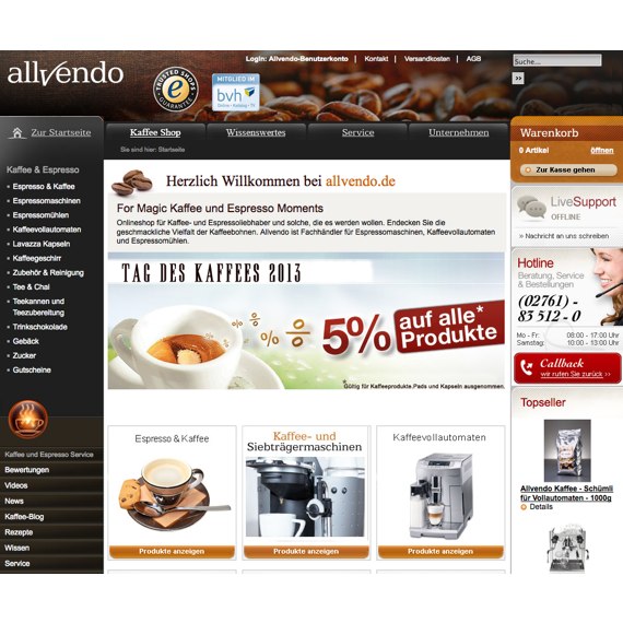 Nicht umsonst bezeichnen derartig viele zufriedene Kunden diesen Anbieter als ausgezeichnet, also machen Sie eine Probe aufs Exempel. Geraten Sie als Kaffeeliebhaber ins Schwärmen, wenn Sie hier Ihren hochwertigen Kaffee bestellen, denn Sie bekommen sämtliche erdenklichen Sorten nach Ihrem Geschmack und es gilt, sich manche Aktion zu sichern, denn hier finden Sie stets aktuelle Neuheiten.