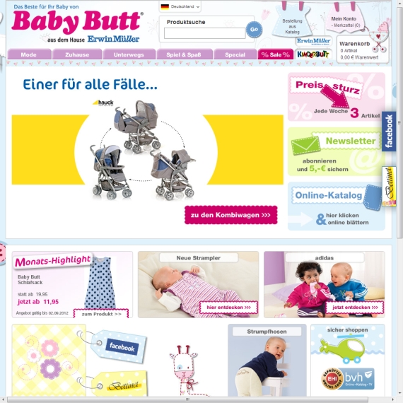 Im Onlineshop von Baby Butt finden Sie alles, was Sie für Ihren Nachwuchs brauchen. Sämtliche Waren stammen aus dem Hause Erwin Müller und stehen für beste Qualität. Viele andere Anbieter fokussieren sich nicht wirklich auf das Kind selbst, doch ganz anders ist es hier, denn hier hat das Baby immer Priorität. Genießen Sie die riesige Auswahl für Ihren Liebling und suchen Sie genau das aus, was Sie brauchen. Die Auswahl ist immens und angefangen bei geeignetem Spielzeug, bis hin zu Babymöbeln oder Kinderwagen und noch vielem mehr gibt es alles, was das Herz begehrt, denn hier besteht wahrhaftig kein Mangel.