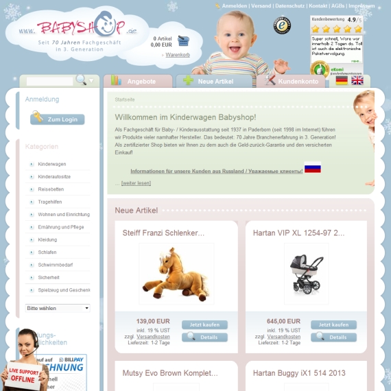 Online Shop von Babyshop vorbei, denn hier schwelgen Sie im siebten Himmel. Überzeugen Sie sich selbst von der besten Qualität, die es auf dem Markt gibt, denn das Unternehmen besteht nicht umsonst bereits seit dem Jahr 1937. Werden Sie Kunde, denn endlich können Sie die Vielfalt auch über das Internet nutzen und lassen sich bequem bis nach Hause beliefern, denn hier sparen Sie Zeit und auf alle Fälle auch Geld. Sie werden garantiert schnell von den fairen Preisen überzeugt sein, also flanieren Sie am besten durch die Rubriken. Beginnen Sie Ihre virtuelle Shoppingtour am besten direkt auf der Startseite, um erste Eindrücke zu gewinnen. Gerne können Sie zwischen deutscher oder englischer Sprache wählen, denn der Kunde ist immer König.