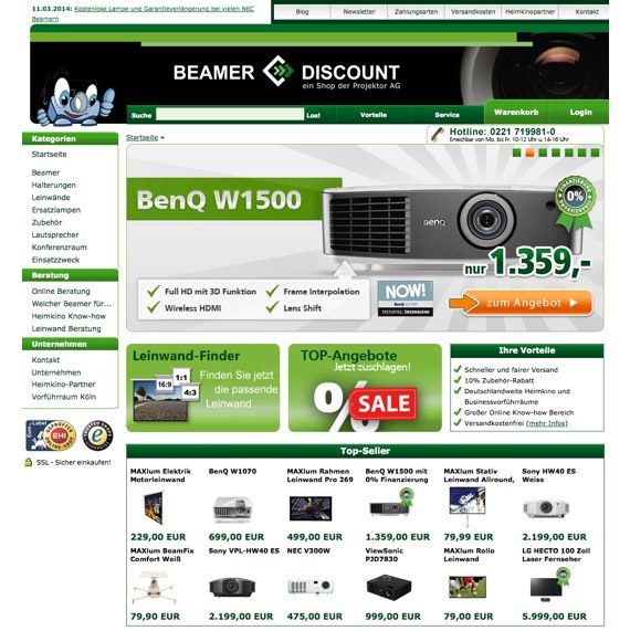 beamer-discount wird Sie als Onlineshop besonders ansprechen, wenn Sie sich für Beamer und Leinwände oder ein eigenes Heimkinosystem interessieren. Nicht umsonst besteht das Unternehmen bereits erfolgreich seit zwölf Jahren auf den Markt für Beamer und Projektoren, also sparen Sie sich eine weitere Suche und nutzen Sie ein Angebot in Aktion.