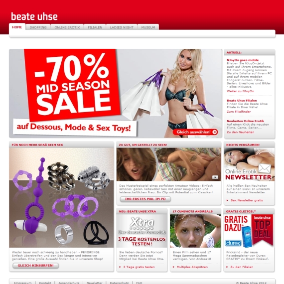 Sie haben sich bis jetzt immer geschämt, in so einen Laden zu gehen? Kein Problem – der Online Shop von Beate Uhse ist endlich die Lösung! Bestellen Sie total anonym und lassen Sie sich sämtliche Stücke bis nach Hause liefern, ohne dass es jemand merkt. Hier finden Sie erotisches Sexspielzeug, sexy Unterwäsche und noch viele weitere Artikel. Die Plattform ist absolut seriös und vertrauenswürdig, so dass Sie sich gut aufgehoben fühlen können.