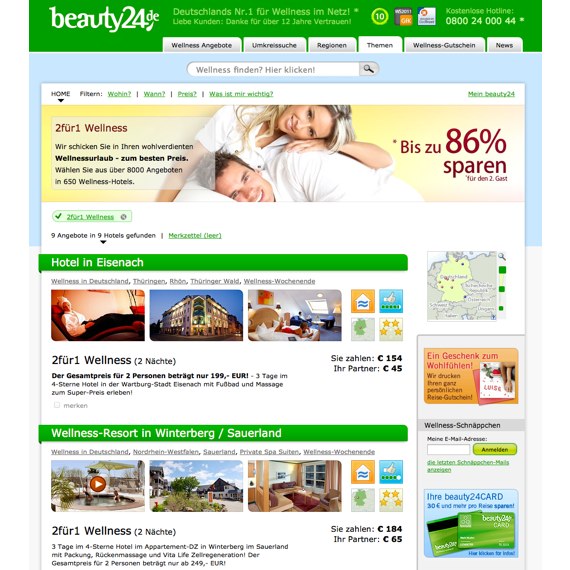 Speziell dann, wenn Sie vom grauen Alltag die Nase voll haben und Ihre Nerven restlos erschöpft sind, sollten Sie sich einmal erholen. Dafür eignet Sie sich die Seite von Beauty24 besonders gut, denn hier können Sie gleich das perfekte Wellnesshotel für Ihre Bedürfnisse zu einem Schnäppchen Preis für wenige Euro Bestellwert sichern. Bestandskunden nutzen das Angebot immer wieder, denn dieser seriöse Anbieter offeriert auch Ihnen bei der Restplatzbörse günstige Restplätze in Aktion. Nutzen Sie Ihre Beauty24 Gutscheine, denn diese werden hier gerne gesehen, und machen Sie ein richtiges Wellness Schnäppchen. Für eine erste Orientierung begeben Sie sich am besten direkt auf die Startseite, um folglich durch die Rubriken zu schwelgen. Diese Agentur hat sich auf Wellness-Reisen spezialisiert, so dass Sie sich gut aufgehoben fühlen können.
