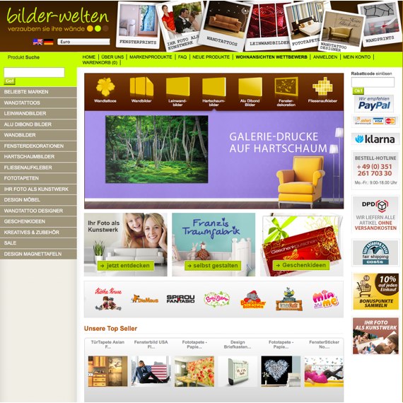 Bilder Welten ist ein Paradies für Angebote aus den Themenbereichen Fototapeten, Leinwandbilder und Wand-Tattoos. Shoppen auch Sie hier, wenn Sie kreativ werden wollen und Ihre eigenen vier Wände neu schmücken möchten, denn bei diesen Preisen machen Sie im Handumdrehen ein Schnäppchen und sparen ein paar Euro mehr. Nutzen Sie ganz besonders die Artikel in Aktion, denn das riesige Angebot wechselt sich ständig ab, was Bestandskunden wissen. Trotzdem bleibt der Bestellwert in jedem Fall niedrig, wenn Sie Ihre Bilder Welten Gutscheine einbringen! Direkt auf der Startseite finden Sie oben links die Kategorie für beliebte Marken, so dass Sie sich einen Überblick über sämtliche vertretenen Labels verschaffen können. Gerne können Sie selbst zum Designer werden oder sich ganz einfach durch die