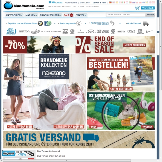 Blue Tomato ist genau die richtige Adresse im Internet für Neukunden oder Bestandskunden, wenn es darum geht, sich für das Surfen oder Snowboarden rundherum auszustatten. Starten Sie einen Versuch und füllen Sie Ihren virtuellen Einkaufskorb, denn hier gilt es, keinen besonderen Mindestbestellwert für Ihren persönlichen Rabatt zu erreichen. Sparen Sie so richtig viel Geld und flanieren Sie durch die unterschiedlichen Artikel, denn Sie können Ihre Auswahl aus mehr als 100.000 unterschiedlichen Artikeln treffen. Es stehen Ihnen zudem noch 400 unterschiedliche Topmarken von namhaften Herstellern zur Verfügung, so dass Sie garantiert fündig werden. Am besten begeben sich vor Ihrem Online Einkauf noch kurz auf unser Portal, denn hier holen Sie sich Ihren exklusiven Blue Tomato Gutscheincode!