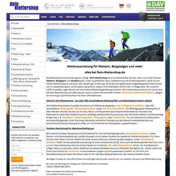 Wenn Sie gerne klettern gehen, werden Sie sich auf der Seite von Dein-Klettershop ganz besonders wohl fühlen, denn dieser Onlineshop präsentiert Ihnen zahlreiche Schnäppchen für wenige Euro in Aktion auf der Seite. Nutzen Sie das Angebot für Ihre nächste Klettertour oder sehen Sie sich den niedrigen Bestellwert der mehr als 500 unterschiedlichen Modelle an. Bestandskunden kommen gerne immer wieder zurück, also holen auch Sie sich gleich jetzt Ihre Dein-Klettershop Gutscheine für einen besonders günstigen Einkauf. Entdecken Sie tolle Sonderangebote zum Thema Bergsport im Ausverkauf oder holen Sie sich Weichbodenmatten in der gewünschten Form und Größe online. Gerne können es auch Turnmatten oder Schulmatten sein, also bestellen Sie alles, was Sie brauchen.