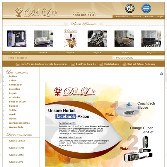 Möbel in Akazie Lava oder doch eher in Sheesham Kolonial? Egal, welchen Stil Sie sich für Ihre eigenen vier Wände wünschen, wenn es um Möbel und Einrichtung geht, sind Sie bei DeLife an der richtigen Stelle. Sie müssen auf Ihren Geldbeutel achten? Dann werden Sie sich ganz bestimmt für die Kategorie Schnäppchen interessieren. Finden Sie hier den perfekten Vorhang, der hervorragend in Ihr Wohnzimmer passt oder bestellen Sie sich eine Kommode von einem angesagten Designer. Warum lockern Sie Ihre Wand nicht einmal mit einem Wandbild auf? Bestimmt bringt Ihnen diese Möglichkeit frischen Wind in die Bude. Kommen Sie bei