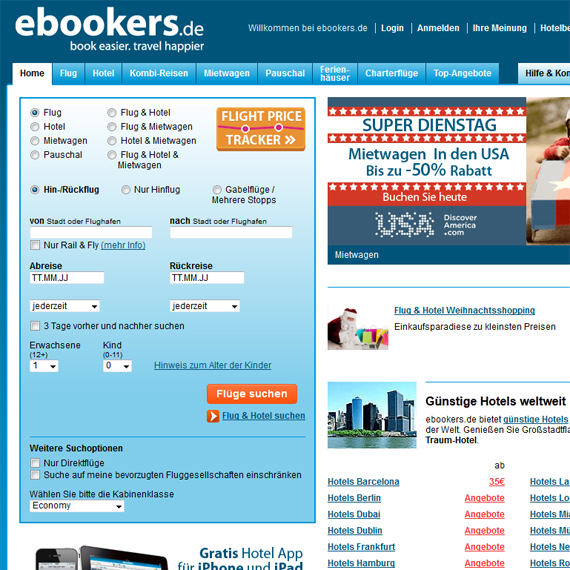 Sie wollen für Ihren kommenden Urlaub schon einmal alles buchen und nicht zu viel Geld für Ihre Reise bezahlen? Wählen Sie das Internet dafür, denn dieser Vorgang liegt absolut im Trend. Weshalb wollen Sie Zeit verlieren, wenn Sie extra ins Reisebüro gehen, wenn auch von zu Hause aus genauso gut alles möglich ist? Noch dazu haben Sie hier die beste Möglichkeit, richtige Schnäppchen zu finden. Begeben Sie sich so schnell wie möglich auf die online Seite von ebookers.de und sichern Sie sich die besten Schnäppchen. Das Portal ist Spitzenreiter, wenn es um Onlinereisen und Kombinationsangebote geht, also worauf warten Sie noch? Finden Sie auch noch weitere tolle Features rund um das Reisen und überzeugen Sie sich selbst von diesem tollen Portal!