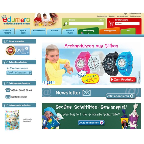 Musik-CDs oder Bücher, welche nach Themen und Alter sortiert sind, denn die Navigation auf der Seite wird Ihnen bestimmt leicht fallen. Gerne können Sie Ihren Edumero Gutscheinwert bei Ihrem Onlineeinkauf verwenden!