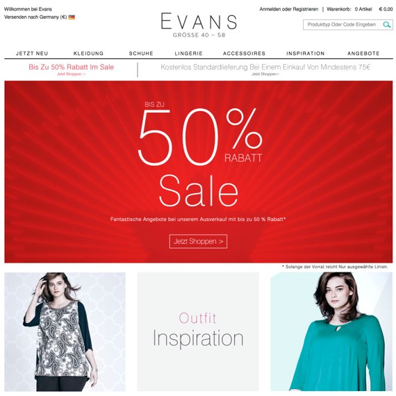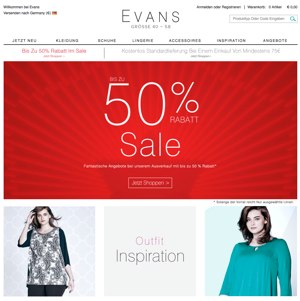 Salebereich und sehen Sie sich bei den Neuigkeiten der Kategorie „Jetzt Neu“ in aller Ruhe an. Bestellen Sie Ihre gewünschte Größe, denn angefangen bei der Größe 40 bis zur Größe 58 können Sie sich alles bei Evans zu mehreren Prozent Rabatt sichern und bequem nach Hause liefern lassen. Für eine noch schnellere Suche können Sie den Produkttyp oder einen entsprechenden