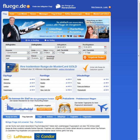 Mit Sicherheit ist Ihnen Fluege.de bereits aus der Fernsehwerbung bekannt, also worauf warten Sie noch? Das Unternehmen steht für Transparenz und Übersichtlichkeit, so dass Sie sich garantiert gut zurechtfinden werden! Grundsätzlich geht es bei Fluege.de darum, mit nur wenigen Mausklicks den günstigsten Flug von verschiedenen Airlines und Anbietern herauszufiltern, aber probieren Sie es am besten selbst und ermitteln Sie eine Strecke Ihrer Wahl. Machen Sie einen Test, denn es ist einfacher, als Sie glauben, und schöpfen Sie die Möglichkeiten aus, die Ihnen hier geboten werden.