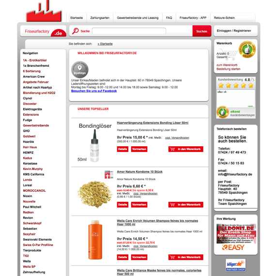 Friseurfactory bietet alles, was das Herz begehrt, wenn es um das Thema Haare und Schnäppchen geht. Sparen auch Sie ein paar Euro durch das sagenhafte Angebot und den niedrigen Bestellwert, denn bei einer aktuellen Aktion können Sie bestimmt nicht Nein sagen. Flanieren Sie durch die Kategorien der angebotenen Marken, welche links auf der Seite gelistet sind. Ganz bestimmt finden Sie tolle Artikel in Aktion, wenn es zum Beispiel eine Feuchtigkeitscreme oder ähnliches sein soll. Bestandskunden sichern sich zu allererst die exklusiven