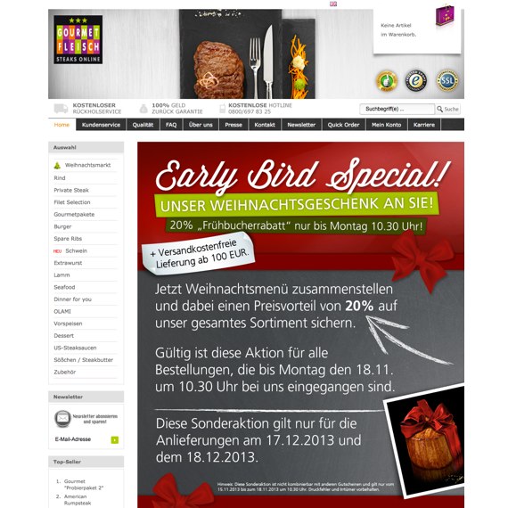 Die Auswahl, die Sie für das konkurrenzlose Festmahl haben, ist auf der Seite von Gourmetfleisch gigantisch. Wenn Sie einen Rabatt wollen, sollten Sie sich Zeit nehmen, damit Sie alles in aller Ruhe durchschauen können. Alle Produkte und Teile sind eingehend beschrieben und Sie wissen stets, wo diese herkommen. Fühlen Sie sich zu 100 Prozent gut aufgehoben, wenn es um das Thema Fleisch und die entsprechende Lieferung geht, denn Neukunden freuen sich darüber, hier sogar ein komplettes Abendmenü zu finden. Bei den Topsellern links auf der Seite finden Sie gute Ideen für die Onlinebestellung. Wie wäre es zum Beispiel mit einer netten Vorspeisebox? Lernen Sie mehr über Ihr Steak und die Zubereitung dafür direkt auf der Seite.