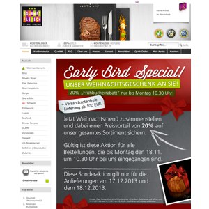 Entdecken Sie das Angebot für Dinner for You auf der Seite und sichern Sie sich zum Sparen Ihren Gourmetfleisch Gutscheincode, welchen Sie auf unserem Portal oft sogar ohne Mindestbestellwert erhalten. Wenn Sie Wert auf ein riesiges Sortiment und einen guten Warenwert legen, sollten Sie sich diese Angebote sichern. Sollten die Produkte Ihren Wünschen nicht entsprechen, können Sie den kostenlosen UPS-Rückholservice nutzen. Nicht umsonst wurde dieser Online Shop von eKomi als exzellent ausgezeichnet, also starten Sie einen Versuch!