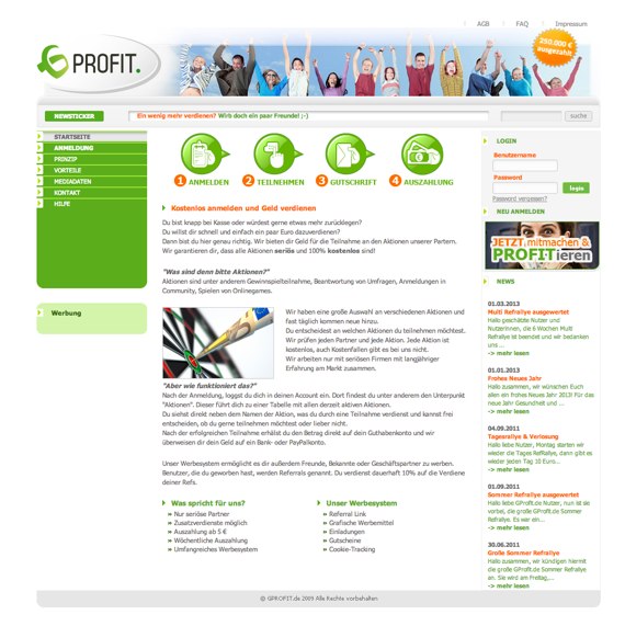 kleinen Nebenverdienst auf der Seite von GProfit. Besonders Neukunden, die Wert darauf legen, ein paar Euro nebenher zu machen, können sich hier die Produkte und Leistungen näher ansehen, um zu 100 Prozent eine Möglichkeit entdecken, um etwas Geld nebenher zu verdienen. Die Registrierung auf der Plattform erfolgt kostenlos und der Anbieter kooperiert mit zahlreichen seriösen Partnern, welche unterschiedliche Aktionen veranstalten. Zu denen zählen zum Beispiel Flirtportale, Online Spiele, diverse Umfragen oder Gewinnspiele. Folglich treffen Sie selbst die Entscheidung, an welcher dieser Aktionen Sie teilnehmen. Sobald Sie erst einmal registriert sind, können Sie sich alle aktuellen Möglichkeiten anzeigen lassen. Klicken Sie einfach auf den Bereich, der Sie anspricht, um sich näher zu informieren. Wenn Sie schließlich und endlich an einer dieser