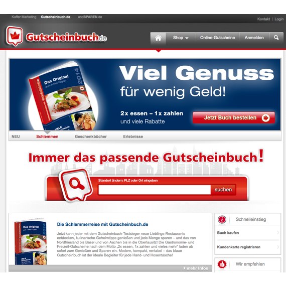 Nutzen Sie eine neue Variante zum Geld sparen und besuchen Sie dafür die Seite von Gutscheinbuch, denn hier wird Ihnen beinahe alles in Aktion in Form von diversen Gutscheinen angeboten. Holen Sie sich Ihren persönlichen Rabatt, den Sie sich bei diesem Anbieter ganz bequem sichern können, denn Bestandskunden stellen es genauso clever an.