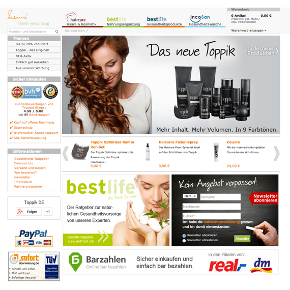 Die Seite von Heiner Versand ist für Sie die optimale Adresse im Internet, wenn Sie etwas für Ihre Gesundheit tun wollen. Sparen Sie einige Euro durch die zahlreichen Schnäppchen direkt in der obersten Kategorie im Menü oder begeben Sie sich ganz einfach zu den Empfehlungen auf der Hauptseite. Der Bestellwert wird Sie überraschen, wenn Sie sehen, wie hochwertig Sie einkaufen und Ihre Gesundheit fördern. Nicht umsonst gibt es schon so viele Bestandskunden, die das riesige Angebot bereits schätzen, also shoppen auch Sie angesehene Waren in Aktion. Wie wäre es zum Beispiel mit Toppik? Bleiben Sie aktiv und sorgen Sie für die optimale Fitness, damit Sie sich im Alltag wohler fühlen, auch wenn Sie im Job gefordert werden. Gerne können Sie Ihre Heiner Versand Gutscheine bei Ihrem Einkauf nutzen, denn diese sind gerne gesehen.