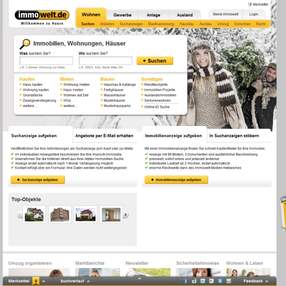 Sie wollen eine Suchanzeige für diverse Immobilien aufgeben bzw. Ihr Haus oder Ihre Wohnung vermieten oder sogar verkaufen? Dann sind Sie bei Immowelt an der richtigen Adresse, denn hier können Sie spielend einfach alles von zu Haus aus an Ihrem PC mithilfe des Internets regeln. Freuen sich über besonders günstige Preise, wenn Sie hier eine Anzeige aufgeben. Beschreiben Sie diese individuell nach Ihren Wünschen und Kriterien, Sie können sogar selbst entscheiden, wie lange die Anzeige laufen soll. Machen Sie sich die große Reichweite von Immowelt zu Nutze, denn die Seite kann täglich sehr viele Besucher verzeichnen, so dass auch Sie Ihr Potenzial so richtig gut ausschöpfen können. Sie planen schon bald einen Umzug? Lassen Sie sich von diesem Anbieter dabei helfen und engagieren Sie einen Profi. Die Seite informiert Sie rund um die Uhr über aktuelle Marktberichte, so dass Sie immer im Bilde sind. Abonnieren Sie doch auch gleich gratis den Newsletter, wenn Sie schon einmal auf der Seite sind. So erhalten Sie sämtliche Tipps und detaillierte Informationen über alle Immobilien, die es zu mieten oder zu kaufen gibt.