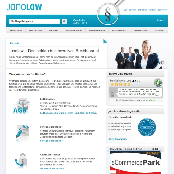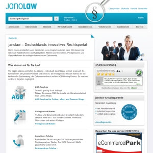 Erbrecht, Familienrecht, Verkehrsrecht, Immobilienrecht, Wirtschaftsrecht, Mietrecht, Internetrecht und Arbeitsrecht. Ganz sicher können Sie hier die entsprechende Rubrik finden, nach welcher Sie gesucht haben. Sie benötigen ein ganz spezielles Lösungsangebot? Machen Sie sich keine Sorgen, hier wird Ihnen geholfen. Finden Sie unterschiedlichste Pakete vor, aus denen Sie getrost Ihre Wahl treffen können, denn wenn es um den Download der Dokumente geht, können Sie sich über viele angesagte Flatrates freuen. Alternativ stehen Ihnen auch diverse Monatspakete zur Verfügung. Sie wünschen telefonische Beratung von einem Experten? Worauf warten Sie dann noch? Besuchen Sie die Seite und werden Sie Kunde bei JANOLAW! Bei diesem Unternehmen erfahren Sie verlässliche und kompetente juristische Beratung in jedem Sinne und können sich individuelle Falllösungen von Experten holen. Wenden Sie sich an die anwaltliche telefonische Erstberatung der Partnerkanzlei, im Falle dass Sie diese Variante bevorzugen und erfahren Sie einen prompten Zugriff auf Datenbanken über das Internet, den geht dieser Marktanbieter macht es möglich! Verwenden Sie auf jeden Fall Ihren