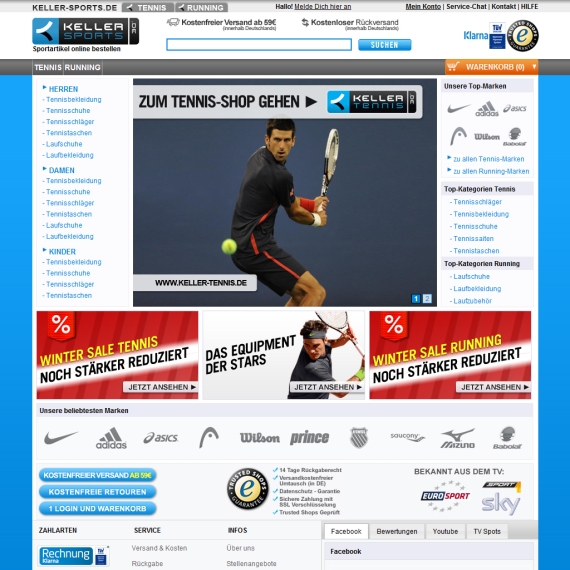 Besuchen Sie den renommierten Online Shop von Keller Sports, denn hier finden Sie alles, wenn es um das Thema Bekleidung und Ausrüstung für Sport geht. Beginnen Sie Ihre virtuelle Shoppingtour in den Hauptkategorien Tennis und Laufen, damit Sie Orientierung finden. Legen Sie alles in den Warenkorb, was Ihnen gefällt, denn hier genießen Sie ein tolles Preis-Leistungs-Verhältnis. Sie sind Tennissportler? Dann haben Sie hier die Auswahl aus mehr als