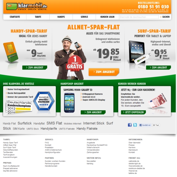 Das Menü ist in unterschiedliche Kategorien eingeteilt, so dass Sie alles in Ruhe durchsehen können. Im Großen und Ganzen teilt sich die Seite in Tarife, Service und Handys auf. Wenn Sie schon Kunde sind, können Sie sich gleich auf der Startseite einloggen. Gerne können Sie jederzeit Ihre Verträge einsehen, wenn Sie etwas nachschauen wollen. Sie interessieren sich für einen Surfstick? Auch diese praktische Utensilie wird Ihnen bei Klarmobil angeboten. So können Sie immer mit Ihrem Netbook oder Notebook unterwegs sein und gleichzeitig das Internet nutzen. Zögern Sie also nicht, sondern sichern Sie sich lieber heute noch Ihren exklusiven und persönlichen Vertrag bzw. Tarif, um bares Geld zu sparen! Noch günstiger wird es mit dem Klarmobil Promotioncode!