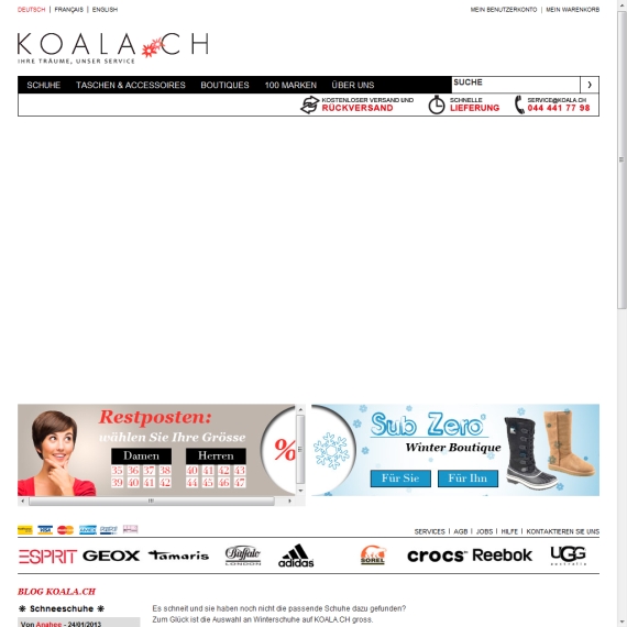 Der koala.ch Online Shop wird Sie in jeder Hinsicht begeistern, denn hier finden Sie ausgefallene Stücke oder wahre Klassiker. Sehen Sie sich bei den Stiefeln, Ballerinas oder Sneakern um, denn hier werden Ihren Wünschen keine Grenzen gesetzt. Wie wäre es mit Gummistiefeln oder Sandalen? Sogar
