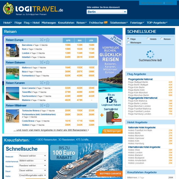 Nebenbei finden Sie noch zahlreiche Unterkünfte auf der ganzen Welt, wenn es Sie an andere Orte zieht und Sie genießen ein tolles Preis-Leistungs-Verhältnis, denn auch für den kleinen Geldbeutel ist etwas zu finden. Sie wollen Ihr euren Flug getrennt vom Hotel buchen? Aus auch das ist mit Logitravel möglich, also warum zögern Sie noch? Denken Sie gleich daran, Ihren passenden Mietwagen zu fixieren, denn so wissen Sie alles auf einmal abgedeckt. Haben Sie sich schon einmal mit dem Gedanken gespielt, eine ansprechende Kreuzfahrt zu unternehmen? Begeben Sie sich in die Karibik oder erkunden Sie den Norden Europas, denn als Kunde steht Ihnen alles offen!