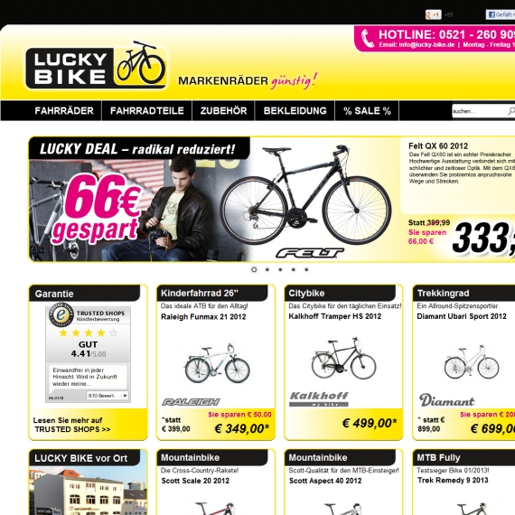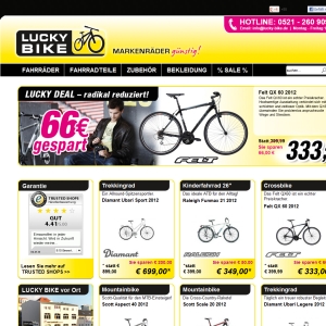 Begeben Sie sich auf das riesige Onlineportal von Lucky Bike, denn hier finden Sie alles, was mit Fahrrädern zu tun hat. Freuen Sie sich über eine vielfältige Auswahl, wenn es um Markenhersteller geht und Räder, welche Sie zu besonders günstigen Preisen hier online bestellen können.