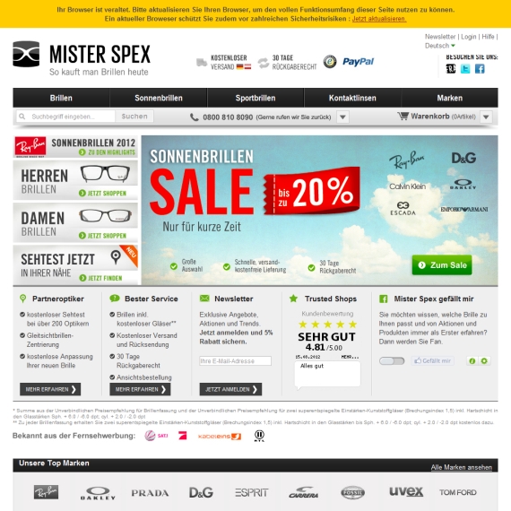 Mister Spex ist ihre erste Adresse im Internet, wenn Sie Brillenträger sind oder Kontaktlinsen tragen. Denn in diesem Online Shop erhalten Sie ein riesengroßes Produktangebot zu erstaunlich günstigen Preisen. Gerade wenn die Sehstärke ziemlich schlecht ist, kann es dann schon einen großen Unterschied machen, ob Sie beim Optiker vor Ort vorbeischauen oder ganz einfach die Seite von Mister Spex anklicken.
