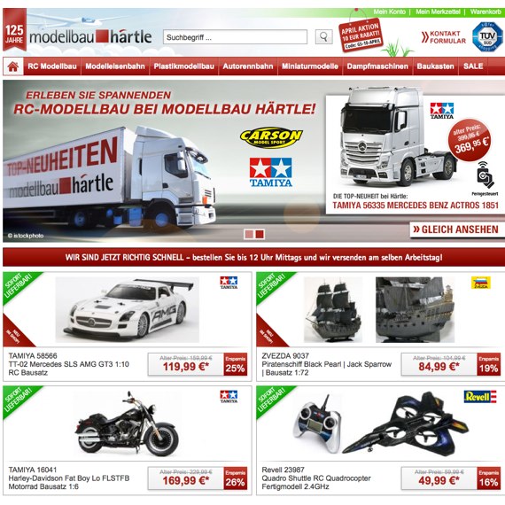 Modellbau Härtle Gutscheine für einen besonders günstigen Einkauf. Sparen Sie Geld, indem Sie die Produkte vergleichen, denn dieser Wert der Qualitätsprodukte kann sich sehen lassen. Der aktuelle Warenwert wird Ihnen immer im Warenkorb angezeigt, so dass Sie eine gute Übersicht behalten. Sehen Sie sich bei den unterschiedlichen Modellen um, denn das Menü ist einfach gegliedert. Gerne können Sie auch einen Suchbegriff für die Schnellsuche oben im Feld eingeben.