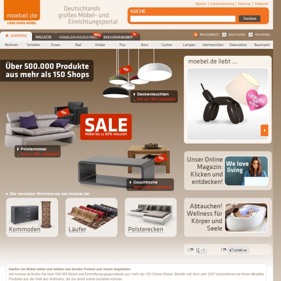 Moebel.de bietet Ihnen eine innovative Möglichkeit, Ihr zu Hause neu einzurichten und das noch dazu komplett nach Ihren Wünschen und nach Ihrem Geschmack. Insgesamt haben Sie die Qual der Wahl aus mehr als einer halben Million Produkten, also worauf warten Sie noch? Gerne können Sie durch die online Angebote flanieren oder konkret suchen und sich in entsprechenden Kategorien für