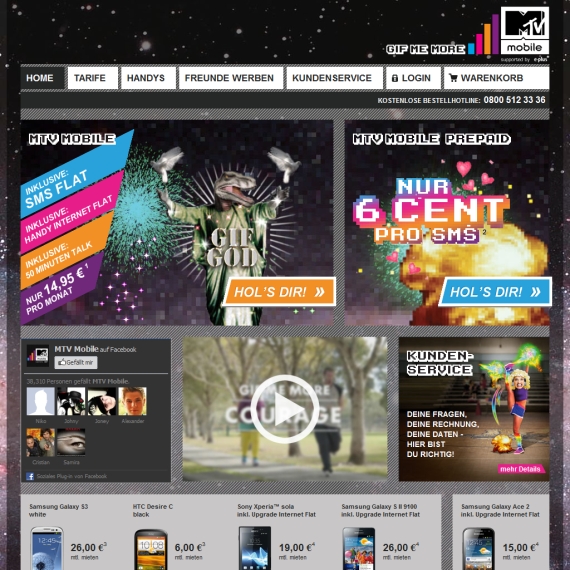 Seit seiner Gründung hat sich MTV Mobile mit seiner vielseitigen und preiswerten Angebotsvielfalt an Tarifen, Handys und Smartphones unter seiner Kundschaft zu einem beliebten Anbieter entwickelt. Das Startmenü der Website von MTV Mobile bietet Ihnen nicht nur einen kreativen Anblick, sondern Sie bekommen ebenfalls eine schnelle Übersicht über Ihre verschiedenen Auswahlmöglichkeiten im Online Shop. Angefangen bei den Tarifen können Sie neben der Option „Freunde werben“ außerdem eine Vielzahl an Handys und Smartphones hinsichtlich Ihrer Funktion, Preis und Ausstattung einfach und schnell miteinander vergleichen. Die Kategorie „Tarife“ bietet Ihnen eine klare Übersicht über aktuelle Flatrate- und Tarifmöglichkeiten. Für jede einzelne Tarifoption erhalten Sie genaue monatliche Preisauskünfte, was Ihnen die Möglichkeit bietet, verschiedene Angebote hinsichtlich des Preis-Leistungsverhältnisses miteinander zu vergleichen. In der Nebenkategorie „Prepaid“ finden Sie reichlich Informationen zu Sparangeboten, Guthabenmöglichkeiten als auch die damit verbundenen Optionen, welche anschaulich und verständlich dargestellt werden.