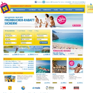 Verwenden Sie die praktische und übersichtliche Suchmaske, um noch schneller an ein Ergebnis zu kommen, denn so buchen Sie kinderleicht Ihren Urlaub online und besonders unkompliziert. Flanieren Sie doch die Hotelangebote und Flugangebote oder sehen Sie sich in den Bereichen für Last Minute und Pauschalreisen um, denn die Recherche wird Ihnen leicht fallen. Auf jeden Fall lohnt sich ein kurzer Blick auf die Startseite, denn hier werden Ihnen immer ganz besonders günstige Angebote offeriert. Lassen Sie sich Empfehlungen von Reiseexperten geben und abonnieren Sie den informativen Newsletter, denn es lohnt sich garantiert. Buchen Sie sicher, denn das Portal wurde eigens vom TÜV zertifiziert und profitieren Sie von den Schnäppchenangeboten! Noch günstiger buchen Sie übrigens mit Ihrem exklusiven und persönlichen Neckermann Reisen Österreich Rabattcode!