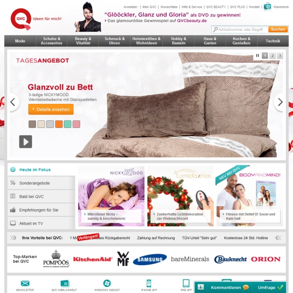Viele Menschen kaufen heutzutage mittels Teleshopping ein, denn das liegt total im Trend. Trotzdem ist es noch angenehmer, sich die Artikel noch einmal genauer anzusehen, bevor man bei den Schnäppchen zuschlägt und endlich kann man das auch online im Shop von QVC tun. Starten Sie Ihren PC und surfen Sie im Internet die Webseite an, um sich sämtliche Vorteile dieses Anbieters zu Nutze zu machen. QVC ist bereits seit mehreren Jahren führend, wenn es um TV-Shopping geht, doch lassen Sie sich am besten selbst von diesen online Portal überzeugen, denn hier bleiben keine Wünsche offen. Kaufen Sie nach Herzenslust alles ein, was Ihnen gefällt, denn die Seite steht Ihnen ununterbrochen zur Verfügung. Schauen Sie öfter vorbei, denn es erwarten Sie täglich neue und spannende Artikel, die Ihnen bestimmt gefallen werden. Klicken durch die Rubrik der Topprodukte, damit Sie nichts verpassen und greifen Sie direkt zu.