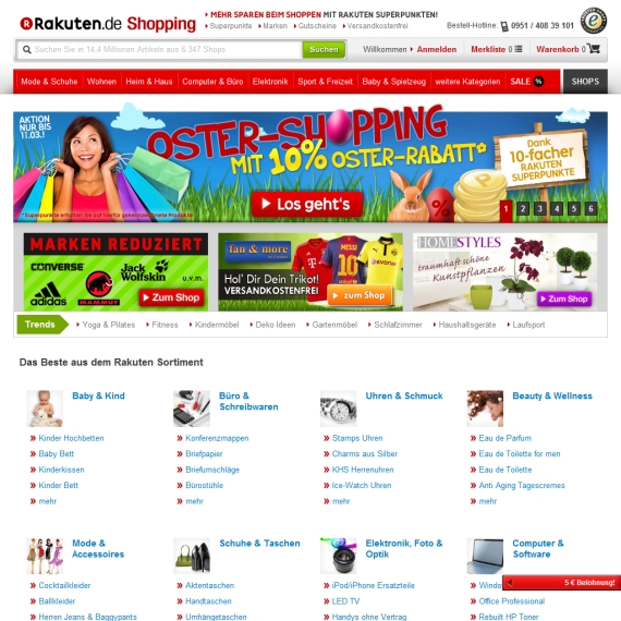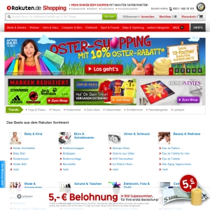 Das Onlineportal von Rakuten bietet Ihnen die riesige Auswahl aus sage und schreibe insgesamt 6000 unterschiedlichen Shops, aus denen Sie getrost wählen können. Genießen Sie dieses riesige virtuelle Einkaufszentrum, in dem Sie nach Herzenslust flanieren können, und klicken Sie sich durch die Angebote, denn dieses Shoppingportal hat es in sich.