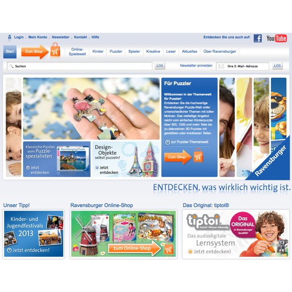 Wenn Sie auf der Suche nach optimalen Spielen für Kinder sind, sollten Sie sich auf der Seite von Ravensburger umschauen, denn hier finden Sie alles zum Thema Spielewelt, Kreatives, Lesen und noch viel mehr. Aber auch an die Großen wurde gedacht, also zögern Sie nicht länger, denn Bestandskunden und Neukunden fühlen sich gleichermaßen wohl, denn der übersichtliche Shop begeistert jeden!