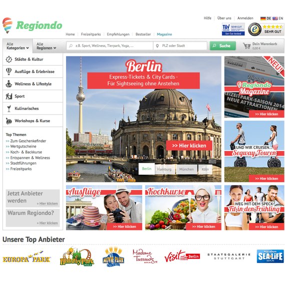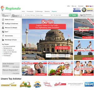 Nicht nur Privatkunden, sondern auch Geschäftskunden und Unternehmen sind auf der Seite von Regiondo gerne gesehen, denn hier ist immer etwas Passendes zu finden, weil sich das Sortiment stets abwechselt. Machen Sie richtige Schnäppchen bei diesem riesigen Freizeit Angebot und holen Sie sich gleich die praktische App für unterwegs. Fühlen Sie sich gut durch die Auszeichnung von Trusted Shops und genießen Sie die Tiefpreisgarantie, denn der Bestellwert für wenige Euro hält sich stets in Grenzen. Bestandskunden klicken sich gerne des Öfteren durch das riesige Angebot, denn durch zahlreiche Offerten gibt es sogar tolle Sparmöglichkeiten in Aktion und zahlreiche Schnäppchen zu buchen. Sparen Sie sich noch ein paar Euro mehr durch Ihre Regiondo Gutscheine. Die Lieferung erfolgt schnell und die Datenübertragung ist sicher.