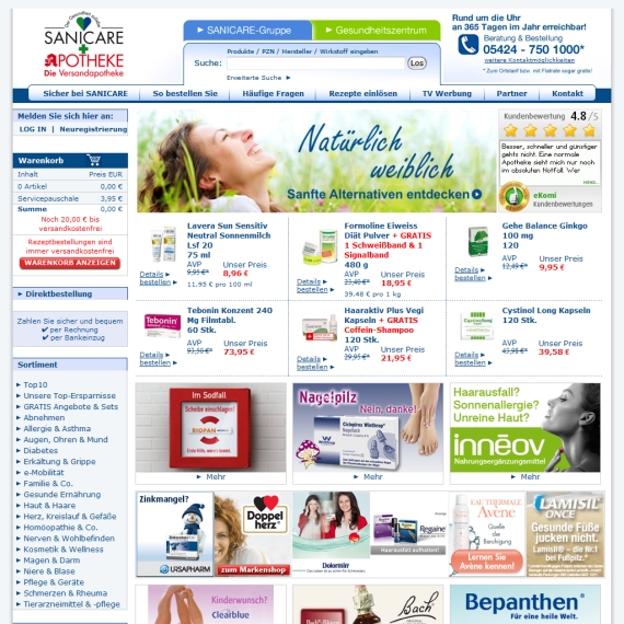 In einer normalen Apotheke, die sich in Ihrem Ort befindet, müssen Sie in der meisten Fällen lange in der Schlange stehen oder das entsprechende Produkt ist nicht erhältlich, weil das Lager viel zu klein ist. Finden Sie bei SANICARE alles, was das Herz begehrt, denn das Sortiment ist riesengroß. Hier wird Ihnen ein besonders hohes Niveau an bester Qualität und hochwertigen Produkte angeboten, so dass Sie richtig Lust aufs Internetshopping bekommen. Dieser Onlineanbieter sticht zweifellos positiv auf dem Markt der Apotheken hervor. Freuen Sie sich über die wesentlich günstigeren Konditionen, die Ihnen hier geboten werden. Durchstöbern Sie den Onlineshop von SANICARE und nehmen Sie die Angebote genauer unter die Lupe.