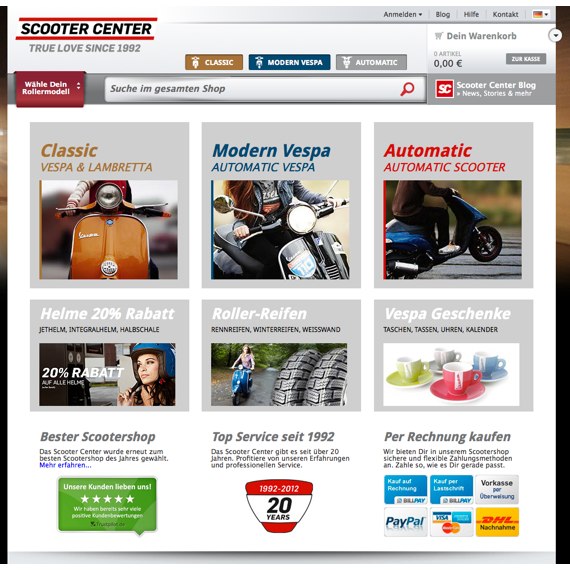 Sehen Sie sich im Online Shop von Scooter Center in Ruhe um, wenn Sie sich für einen neuen Motorroller interessieren, denn hier sind Sie genau an der richtigen Adresse dafür. Holen Sie sich eine klassische oder eine ganz moderne Vespa und klicken Sie dafür auf den entsprechenden Button im Menü. Gerne kann es auch die automatische Variante sein, denn hier sichern Sie sich ohne Zweifel einen unglaublichen Warenwert, was Neukunden schnell zufrieden stellt. Für nur wenige Euro können Sie auch gleich noch das entsprechende Zubehör und Equipment in Ihrem Warenkorb sichern. Nutzen Sie für den Einkauf Ihre Gutscheincodes – den entsprechenden Scooter Center Gutscheincode können Sie sich auf unserem Portal besorgen und diesen folglich zu einem geringen Mindestbestellwert von nur 15 Euro einlösen.