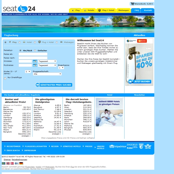 Reisebuchungsportal dieses Anbieters, also wagen seinen kurzen Besuch auf der Seite, um sich erste Eindrücke zu verschaffen. Buchen Sie Ihren Traumurlaub und entdecken Sie tolle Offerte, um Ihren Geldbeutel maßgeblich zu schonen, denn Seat24 macht es möglich! Machen Sie sich die riesige Auswahl zu Nutze, die Ihnen hier geboten wird, denn hier stimmt das Preisleistungsverhältnis auf alle Fälle. Kundenzufriedenheit hat höchster Priorität, so dass Sie sich bestens aufgehoben fühlen können, denn bei Seat24 weiß man, was man tut!