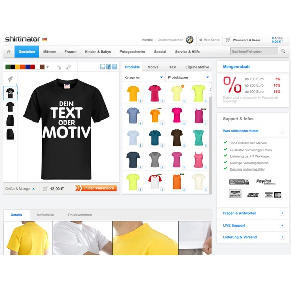 Shirtinator fordert von Ihnen keinen Mindestbestellwert und es sind sowohl Neukunden als auch Bestandskunden herzlich willkommen auf der Seite. Gestalten Sie selbst Ihr T-Shirt und entscheiden Sie sich für einen persönlichen Text oder ein Foto, das Sie für immer festhalten wollen. Nebenbei können Sie sich noch über einen tollen Rabatt freuen, also worauf warten Sie noch? Begeben sich ganz einfach auf die Seite, um sich Inspirationen zu holen, denn es gibt die unterschiedlichsten Vorschläge, an denen Sie sich orientieren können. Noch mehr Geld sparen Sie übrigens, wenn Sie Ihren persönlichen Shirtinator Gutscheincode bei der Bestellung verwenden!