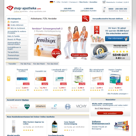 Online Shop von Shop-Apotheke zuschlagen. Hier finden Sie ein vollwertiges Sortiment sämtlicher Arzneimittel, die es auf dem Markt gibt und können nach Herzenslust Ihren Warenkorb füllen. Es warten aber noch viele andere interessante Produkte mehr auf Sie, also nehmen Sie sich Zeit, wenn Sie den Online Shop besuchen. Hier finden Sie nicht nur eine Auswahl, wie in einer normalen durchschnittlichen Apotheke vor, sondern das Lager ist größer, als Sie sich vorstellen können. Hier können Sie alles auf einmal bestellen und binnen kürzester Zeit bis vor Ihrer Haustüre geliefert bekommen, denn alle Waren werden innerhalb weniger Tage verschickt. Überzeugen Sie sich selbst von den vielen zufriedenen Kunden, die sich bereits bei Shop-Apotheke registriert haben.