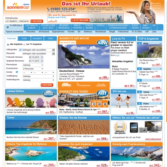 Warten Sie nicht den ganzen Tag auf das passende Angebot vor Ihrem Fernseher, was Ihren Geschmack entspricht, sondern setzen Sie sich vor den eigenen PC und surfen Sie zum Onlineportal von sonnenklar.TV. Freuen Sie sich über die Vielfalt, die Ihnen hier an Schnäppchen geboten wird und vor allem über die guten Preise, die Sie hier erhalten.