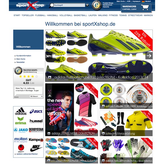 Erima, Jako, Asics, Hummel und Adidas vertreten – trotzdem hält sich der Bestellwert in Grenzen. Klicken Sie sich durch die unterschiedlichen Unterpunkte für Schuhe, Regenbekleidung, Zubehör und weitere und nutzen Sie Ihre SportXshop Gutscheine!
