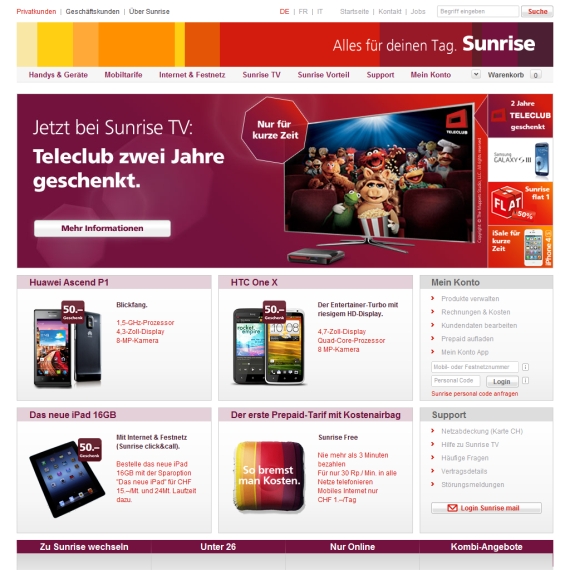 Sunrise hat aber noch viel mehr für Sie zu bieten, als alleinige Angebote rund um den Mobilfunk. Sie möchten einen Festnetzanschluss zu besonders günstigen Konditionen? Entscheiden Sie sich am besten gleich für das gesamte Package, um richtig Geld zu sparen. Nebenbei können Sie gleich ein neues Tablet, wie beispielsweise ein Ipad von Apple in den Warenkorb legen. Am besten entscheiden Sie sich gleich für den passenden Tarif, den es gleich dazu gibt. Sie sehen gerne fern? Sunrise TV ist eine besonders neue und spannende Innovation auf dem Markt. Empfangen Sie besonders viele Sender in bester Qualität und HD. Auf Wunsch können Sie sogar Video on Demand nutzen und sich über viele andere praktische Funktionen freuen. Informieren Sie sich für detaillierte Informationen im Onlineportal von Sunrise, wenn Sie mehr über Sunrise in Erfahrung bringen wollen. Sie möchten Ihre Rufnummer nicht verlieren, sondern diese vom vorigen Anbieter mitnehmen? Kein Problem, die Mitarbeiter von Sunrise stehen Ihnen dabei gerne hilfreich zur Seite. Nutzen Sie Ihren exklusiven Rabattcode, um noch mehr Geld zu sparen.