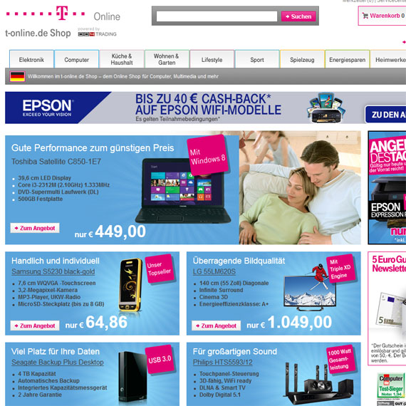 Auch beim Thema Computer werden Sie hier fündig und können sich ganz bequem Ihr Komplettsystem oder Ihren Monitor nach Hause liefern lassen, denn hierzu müssen Sie nicht einmal einen Fuß vor Ihrer Haustüre setzen. Schauen Sie öfter auf der Seite vorbei, denn es erwarten Sie immer wieder top Angebote der Woche, die Ihnen dabei behilflich sind, Ihren Geldbeutel zu schonen. T-Online Shop ist immer für eine Überraschung gut, also worauf warten Sie noch? Werfen Sie einen Blick in das breit gefächerte Sortiment, um einzukaufen.