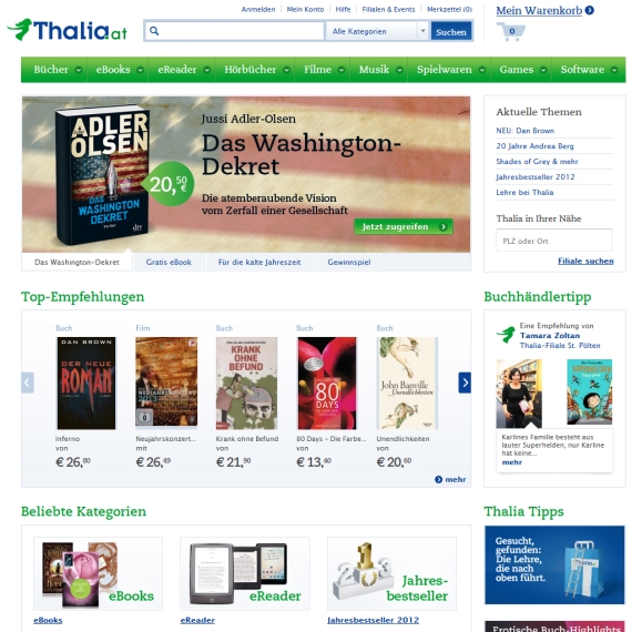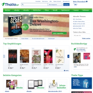 Wenn Sie ein Fan von Büchern sind, sollten Sie unbedingt die Onlineseite von Thalia Österreich entdecken, denn ab sofort ist es endlich auch möglich, Ihre Lieblingsstücke online zu bestellen. Sehen Sie sich auch unbedingt noch bei den Angeboten für die digitale Variante, nämlich das so genannte eBook um, denn hier ist ebenfalls ein breit gefächertes Sortiment zu finden. Freuen Sie sich über die riesige Auswahl, wenn es um Romane oder Bestseller geht und surfen Sie virtuell durch das riesige Angebot, das Ihnen auf dieser online Seite geboten wird. Sie benötigen die passende Hardware, damit Sie Ihre eBooks lesen können? Auch in dieser Hinsicht werden Sie bei Thalia Österreich ganz sicher fündig. Dafür steht eine eigens kreierte Kategorie für Sie bereit, also shoppen Sie einfach drauflos! Auf jeden Fall sollten Sie noch einen Abstecher zu den Angeboten, sowie Büchern des Monats machen, denn so sind Sie immer top informiert, wenn es um Neuerscheinungen geht. Sämtliche platzierten Produkte, die zu den Bestsellern gehören, können Sie hier zu einem besonders günstigen Preis erhalten. Dadurch profitieren Sie als Kunde dieses online Shops noch mehr, denn diese Ware ist einerseits lesbar und andererseits auch immer preiswert.