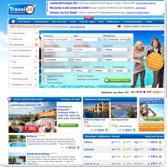 Buchen Sie Ihre nächste Reise auf alle Fälle online bei Travel24, denn hier können Sie besonders clever einen tollen Rabatt absahnen und sich trotzdem über besten Service freuen. Fühlen Sie sich 100 Prozent gut aufgehoben, denn es gilt, richtig zuzuschlagen und sich mit dieser Aktion den einen oder anderen Euro zu sparen.